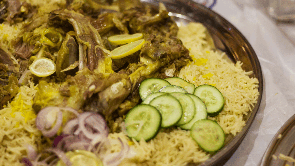 A spiced rice dish from Saudi Arabia that includes meat, almonds, and raisins.