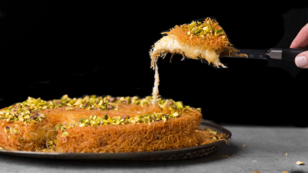 This sweet dessert is prepared by layering shredded phyllo dough with cheese, then baking it and finally drizzling it with sugar syrup, creating a rich, sweet, and indulgent treat.