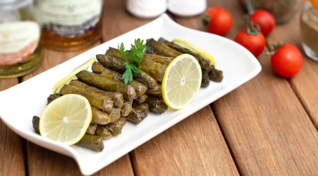 Grape leaves are filled with rice, herbs, and sometimes meat; then they are rolled tightly, creating a flavorful and savory dish enjoyed by many.