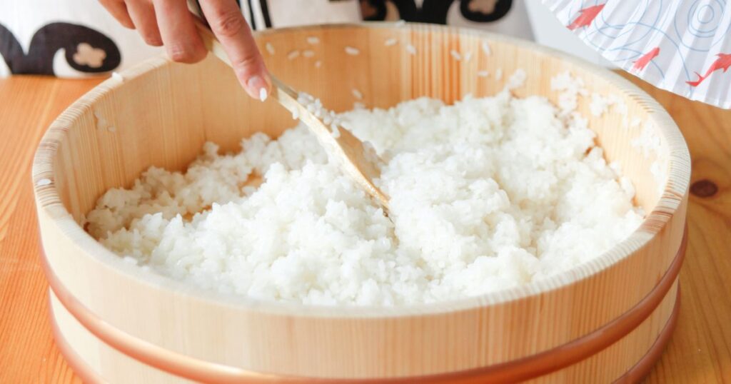 Mix rice vinegar, sugar, and salt; fold into the rice gently.