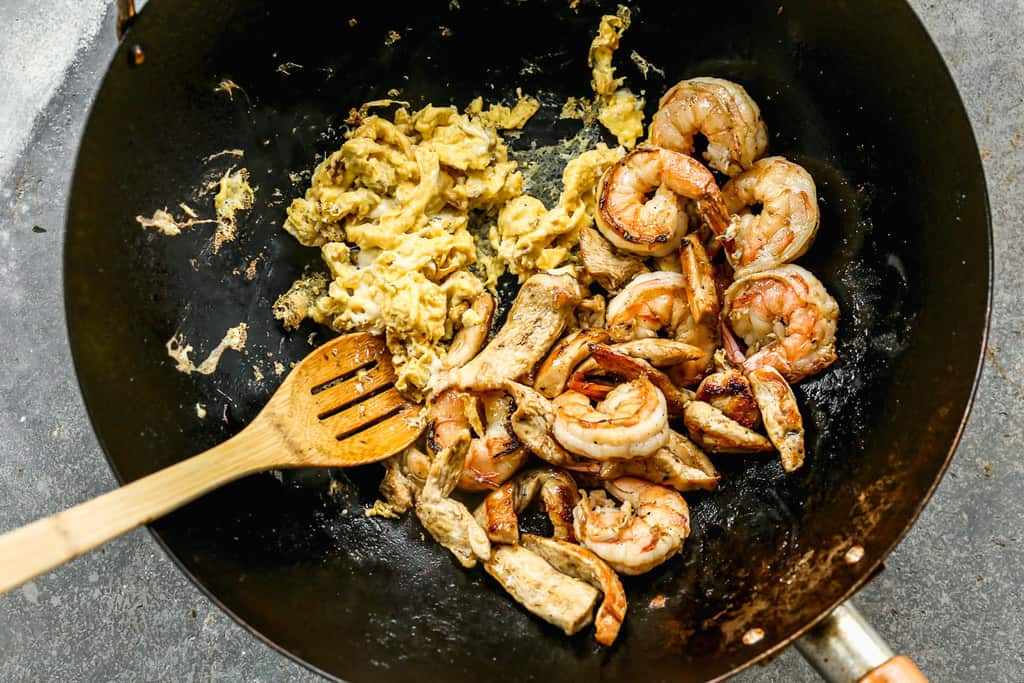 Push ingredients aside and scramble eggs in the wok.
