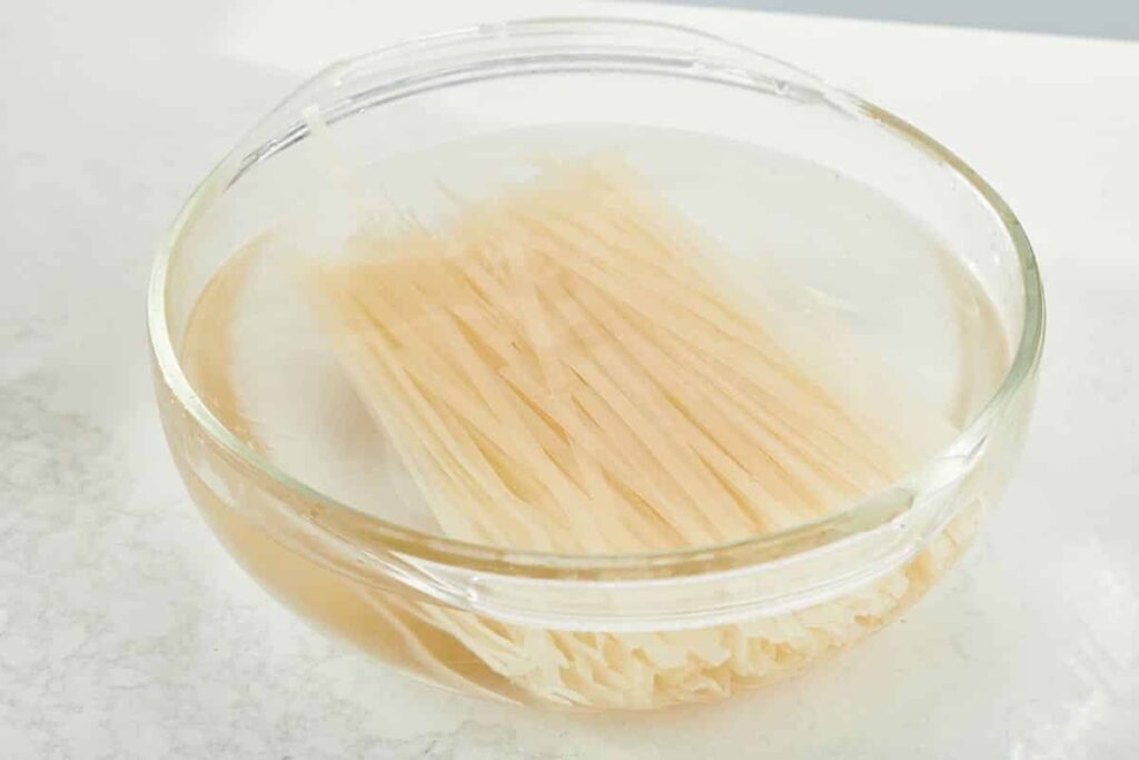 Soak rice noodles in warm water until soft, then drain.