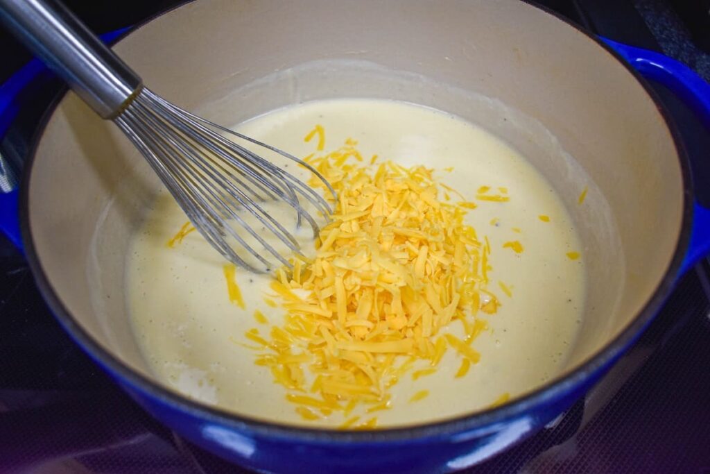 Add cheddar, Parmesan, salt, pepper, furthermore you can also add optional spices. Then stir until the cheese is fully melted and creamy.