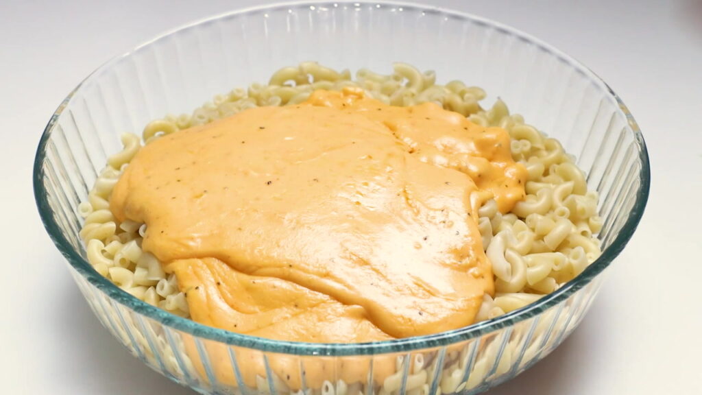 Mix the cheese sauce with the cooked macaroni until evenly coated.